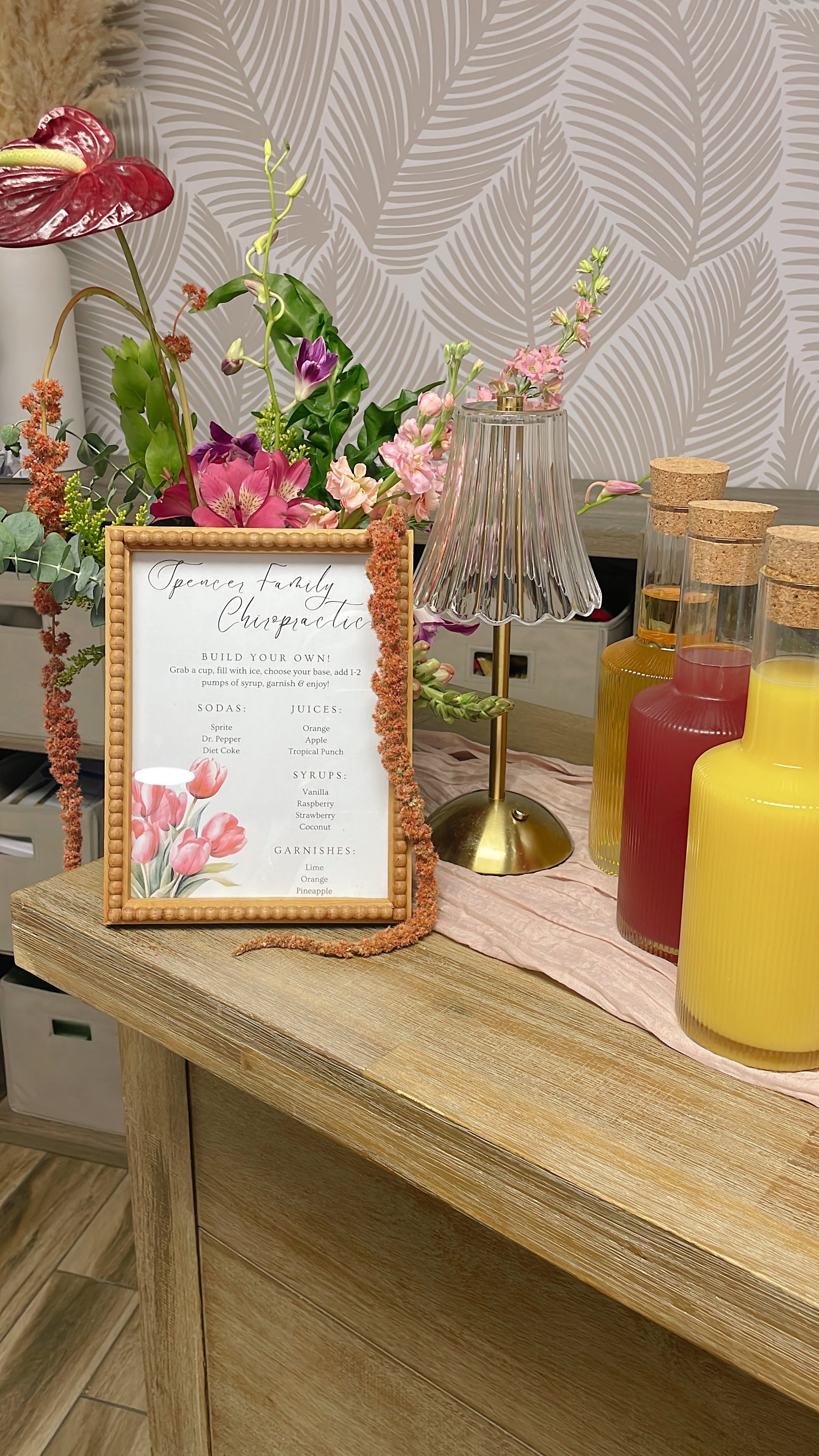 Essentials: Ice, napkins, disposable cups, agave straws, framed paper menu